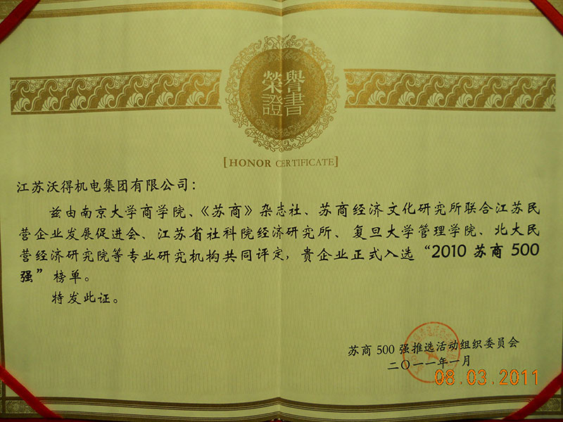 擁有注冊商標(biāo)證書26個,2006年“WORLD” 獲得江蘇省著名商標(biāo)稱號、2009年“沃得”商標(biāo)獲得江蘇省著名商標(biāo)稱號;